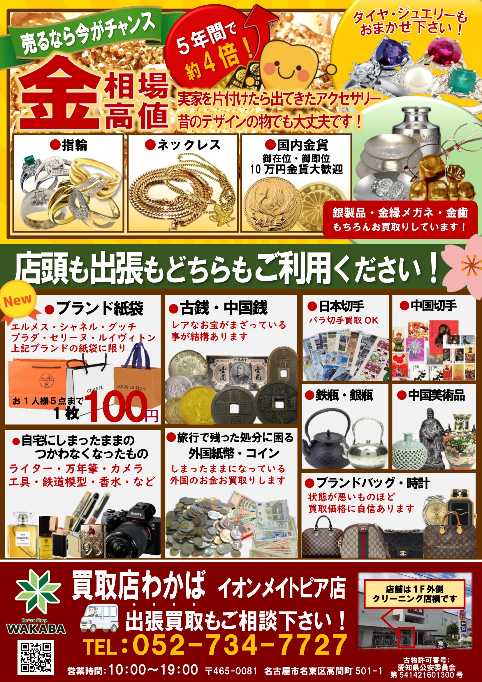 →エルメス・シャネル・グッチ・プラダ・セリーヌ・ルイヴィトンに限り1枚100円でお買取り!(※お1人様5点まで)